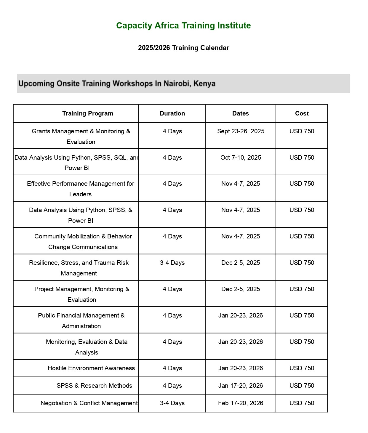 Capacity Africa Training Institute is pleased to invite you to attend Grants Management and Monitoring & Evaluation Workshop scheduled for 23rd–26th September 2025 in Nairobi, Kenya